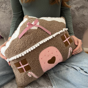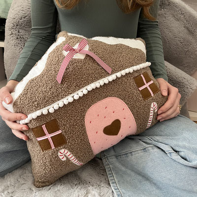 Aus flauschigen Stoffen entsteht mit viel Liebe zum Detail ein süßes Lebkuchenhaus Kissen.